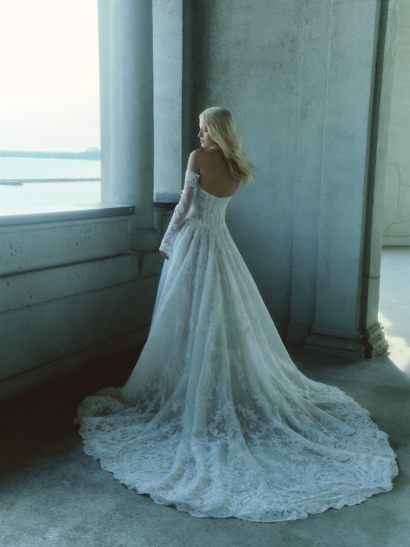 Cameron is a striking fitted gown with beaded, embroidered dimensional lace. It features a detachable tulle gilet neck-piece and watteau train for added drama.