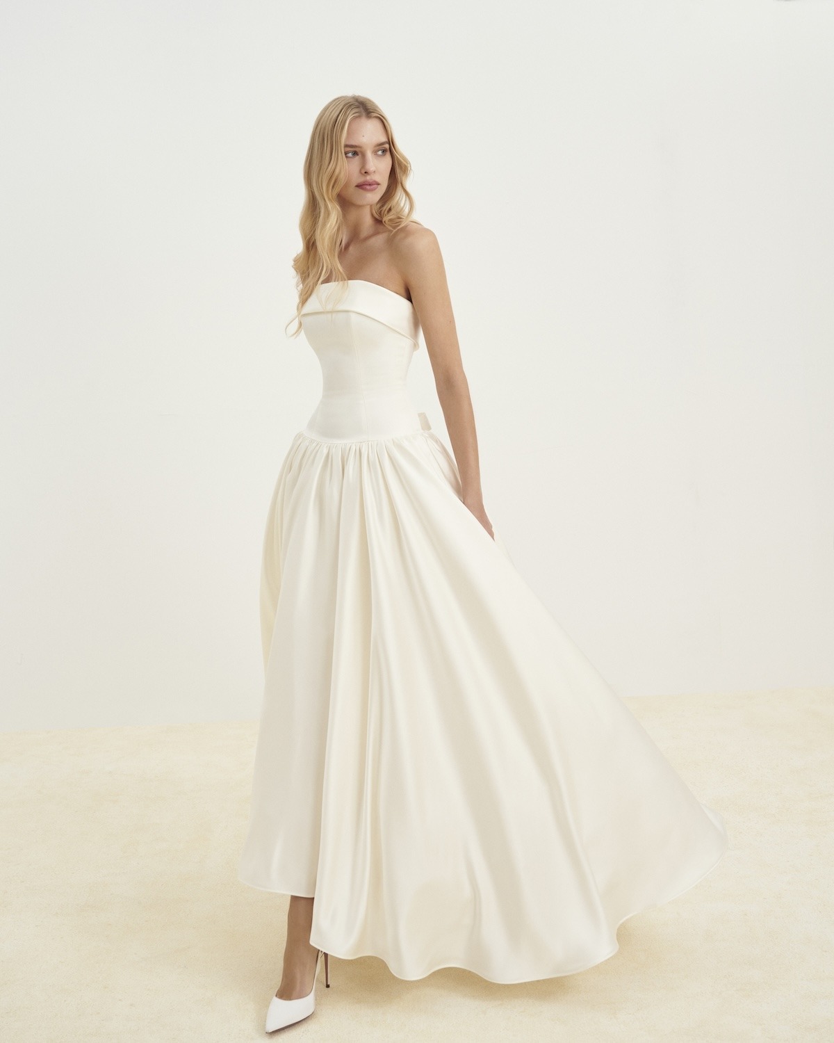 The high-low hemline offers a contemporary twist, allowing brides to showcase their footwear while maintaining a classic bridal look. The satin material provides a smooth and lustrous finish, enhancing the gown's sophisticated appeal.