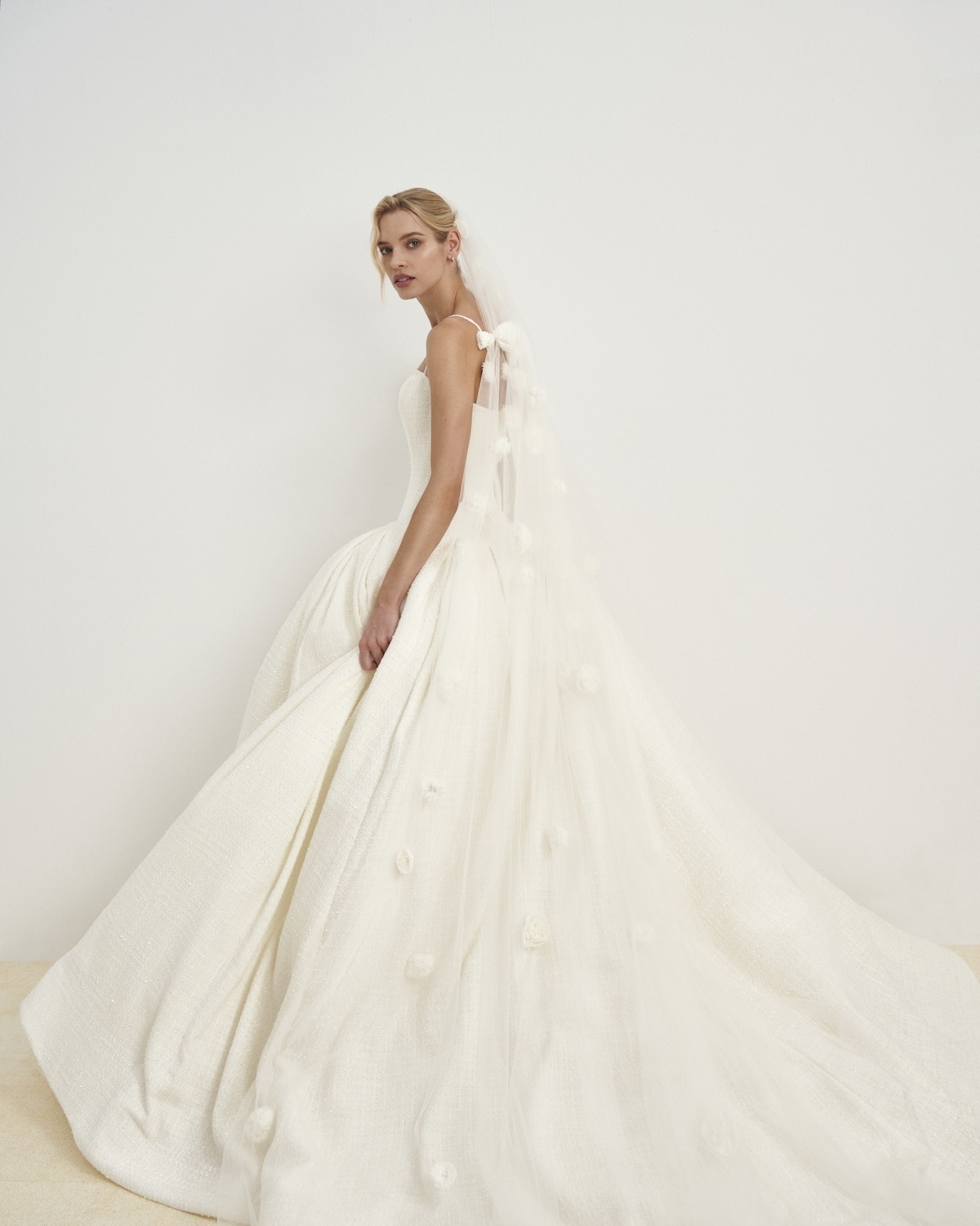 The SE048 gown from Senstudio's Fall/Winter 2025 collection is a distinctive drop-waist ballgown crafted from luxurious tweed fabric. The use of tweed introduces a unique texture, offering a contemporary twist to traditional bridal materials.