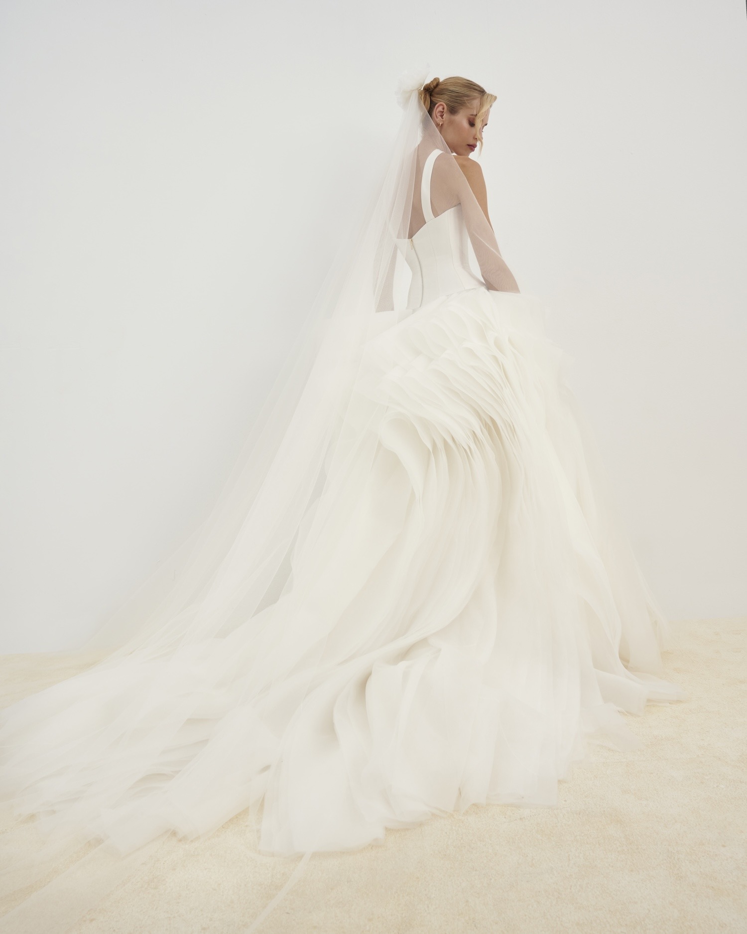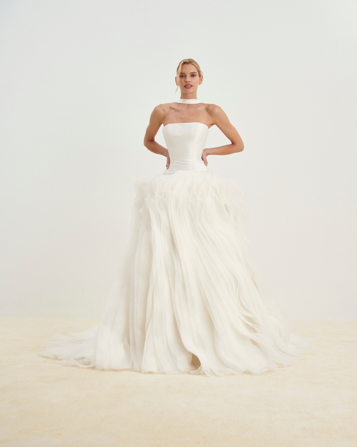The SE046 gown from Senstudio’s Fall/Winter 2025 collection combines the luxurious feel of satin with the delicate artistry of organza. The satin bodice creates a sleek, flattering drop-waist silhouette, while the flowing skirt is adorned with wavy organza detailing, adding an ethereal, dynamic quality to the gown.